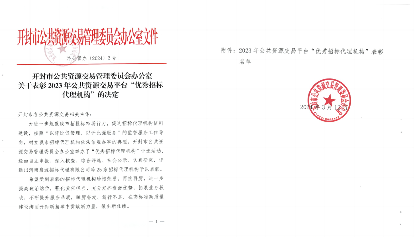 河南省偉信招標管理咨詢有限公司榮獲2023年開封市公共資源交易平臺“優(yōu)秀招標代理機構(gòu)”